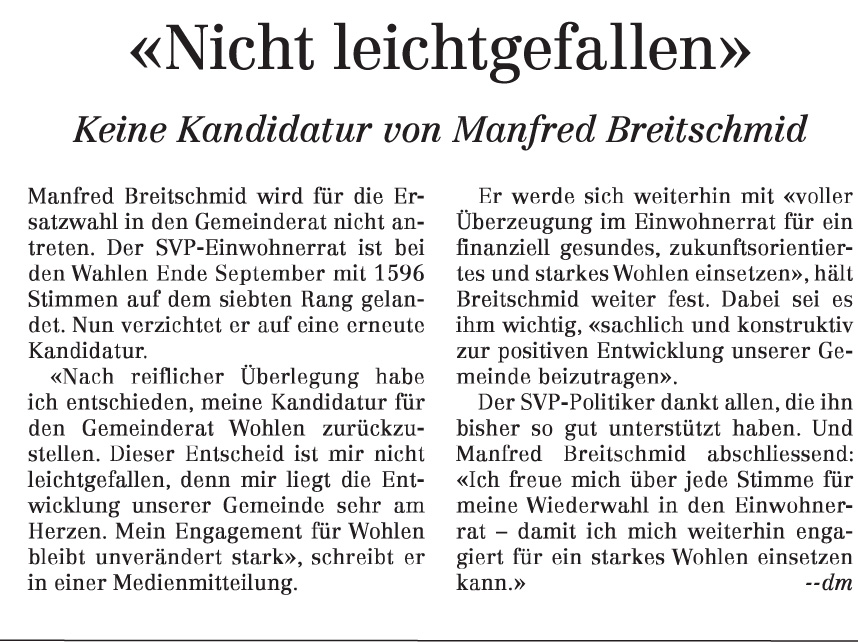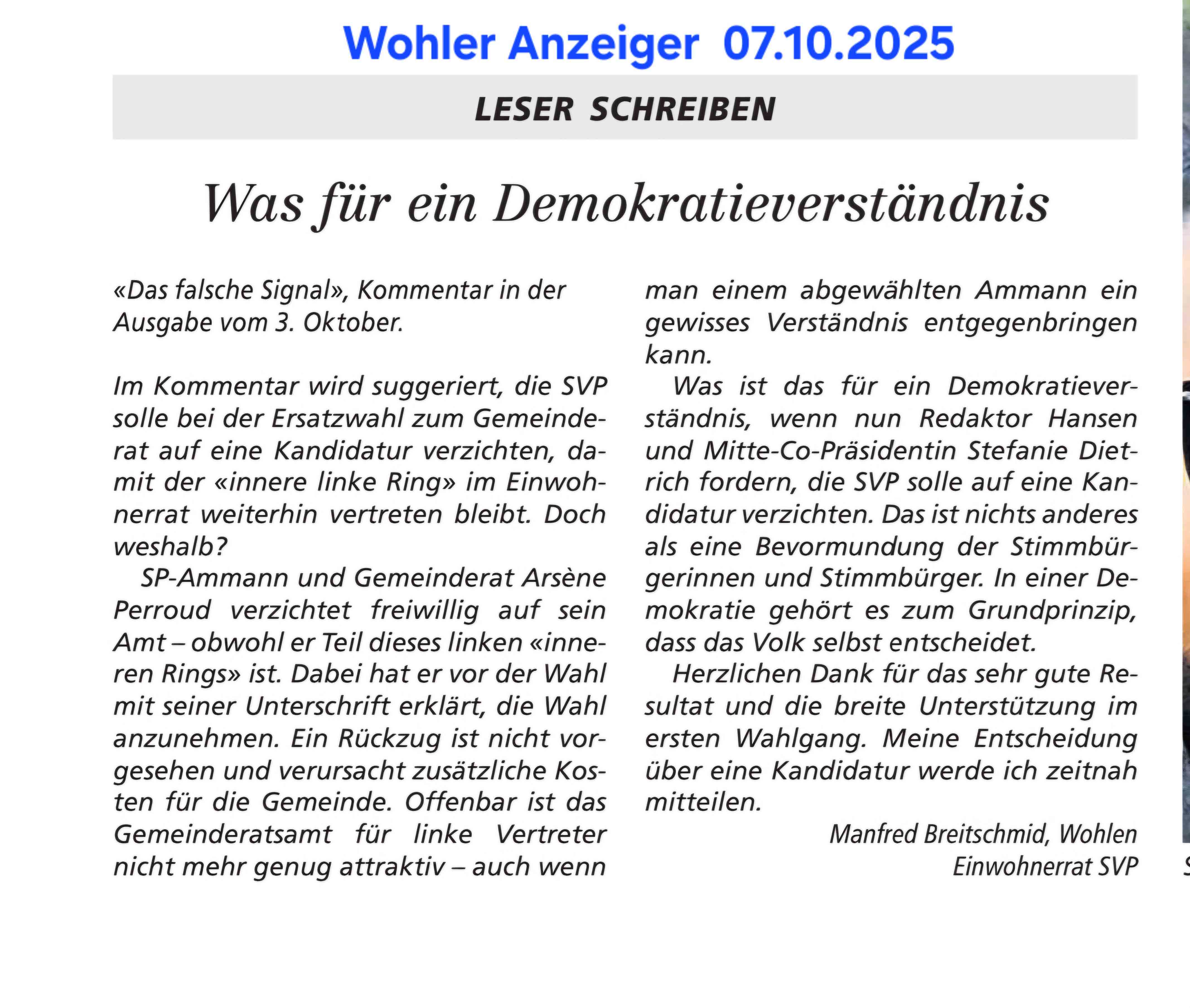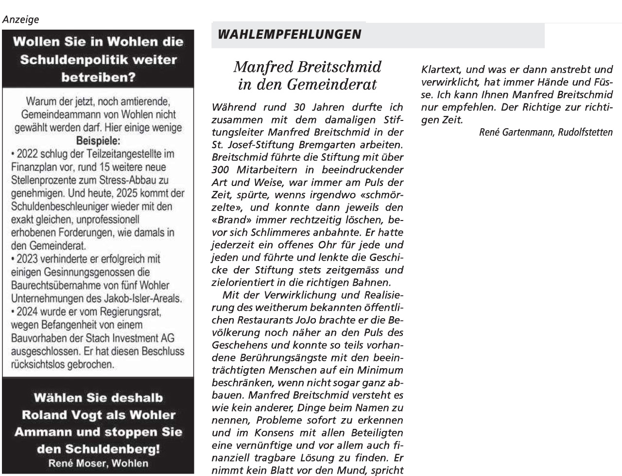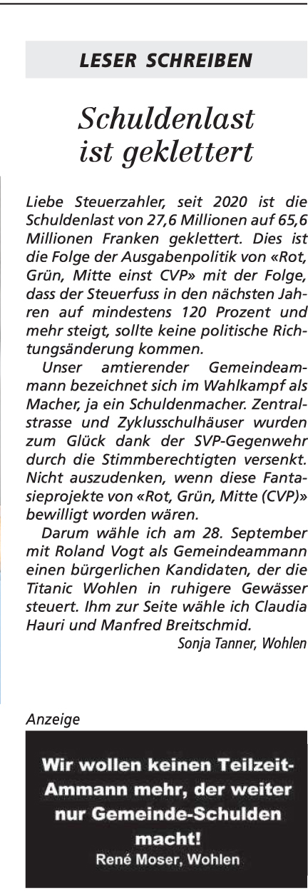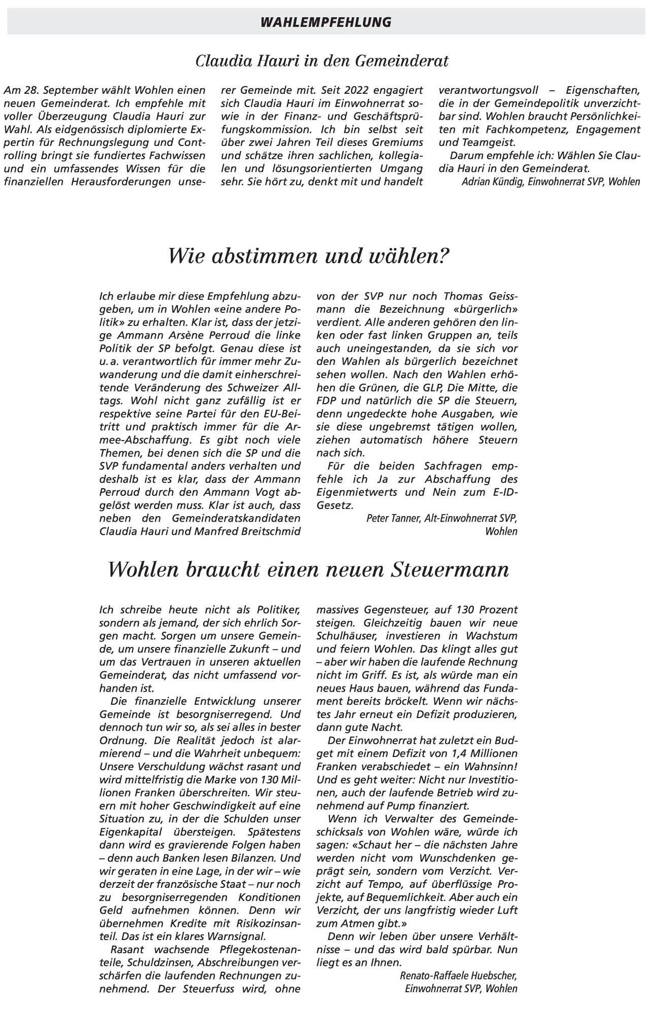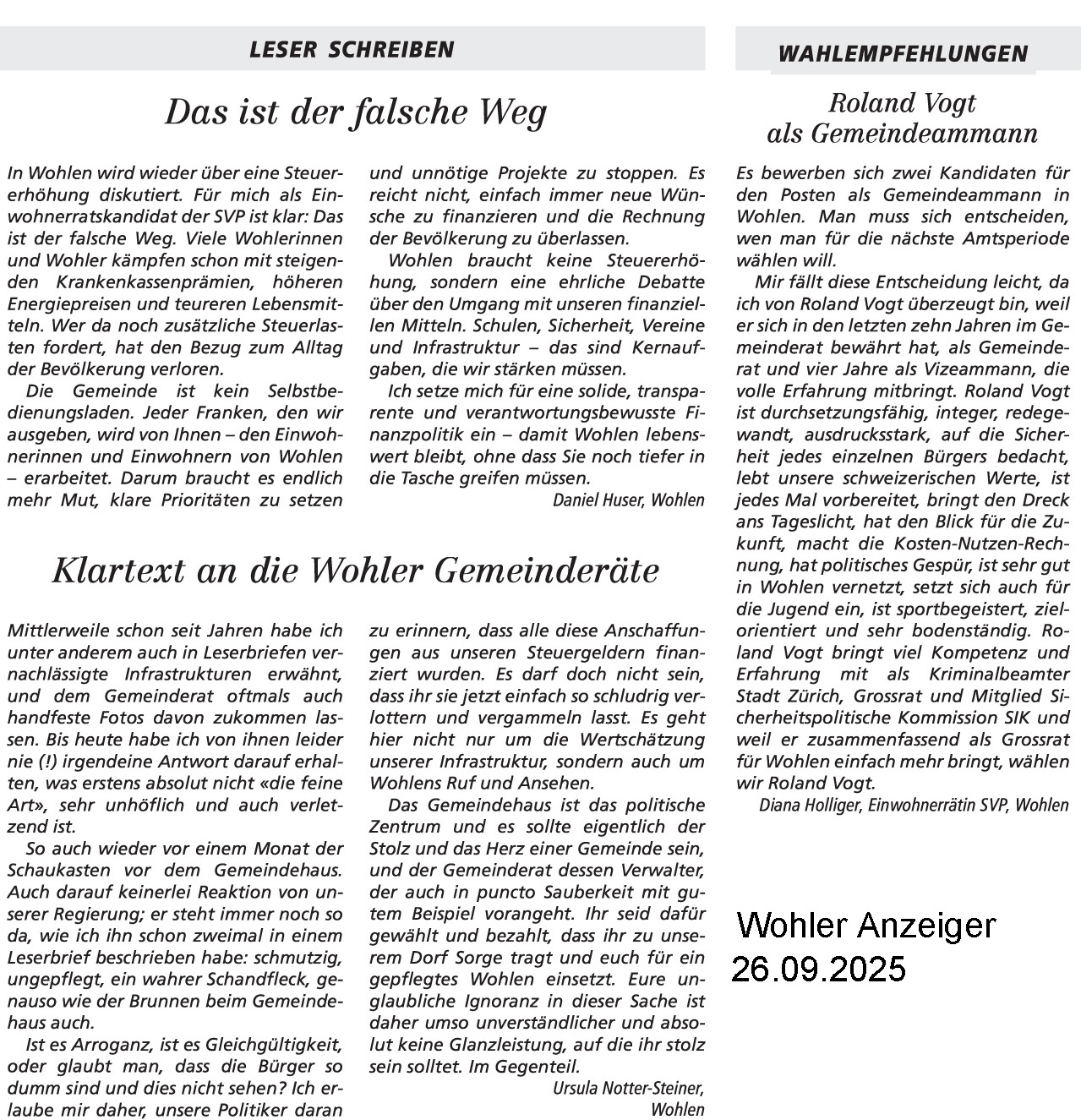 26.09.2025, Daniel Huser "Das ist der falsche Weg" - Ursula Notter-Steiner "Klartext an die Wohler Gemeinderäte" und Diana Holliger "Roland Vogt als