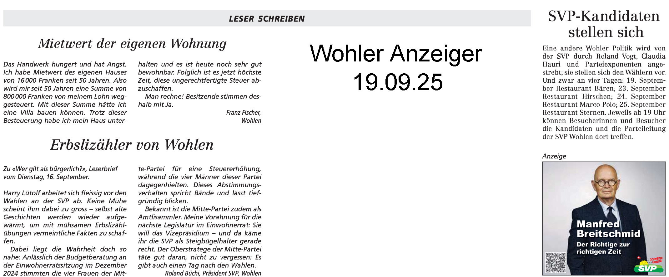 19.09.2025, Franz Fischer "Mietwert der eigenen Wohnung", Roland Büchi "Erbslizähler von Wohlen und SVP-Medienmitteilung