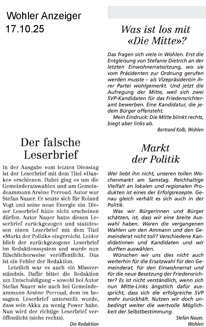 17.10.2025, Bertrand Kolb "Was ist los mit "Die Mitte"? und Stefan Nauer "Markt der Politik", "Der falsche Leserbrief"
